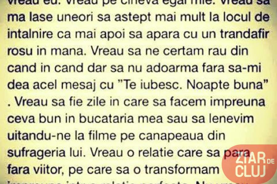 “As vrea o relatie care sa merite. Nu o relatie perfecta, cu un tip care sa faca tot ceea ce vreau eu. Vreau pe cineva egal mie. Vreau sa ma lase uneori sa astept mai mult la locul de intalnire, ca mai apoi sa apara cu un trandafir rosu in mana”.