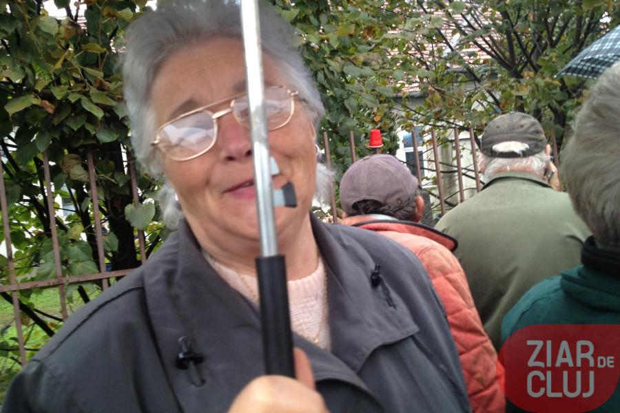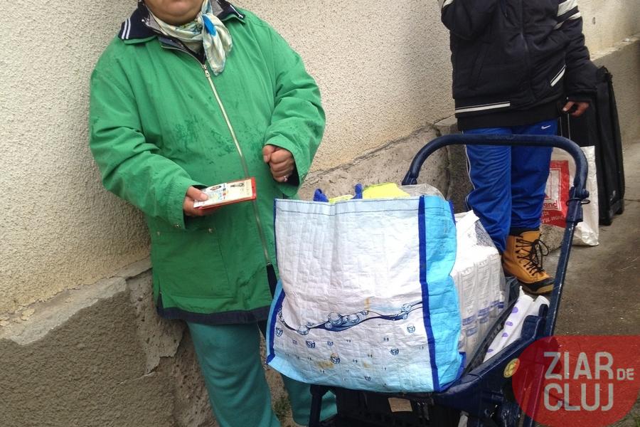 Maria Rusu are haina si umbrela neagra, are 67 de ani, a lucrat 35 de ani la Clujana si sta la coada sa ia ajutoarele pentru sotul ei. Trebuie sa le transporte cum poate pana in Manastur.