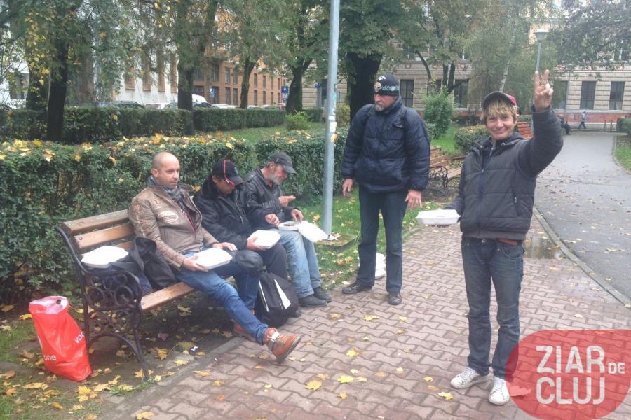 Caserolele au fost deja insirate pe mese, iar Radu imparte mancarea cu un polonic greu. La ora 16.00 iesim in Piata Muzeului, cu caserolele in brate; zeci de oameni asteapta deja. Barbati murdari, cu fetele umflate si lovite de la prea mult alcool, femei sarace, cu plase in mana.