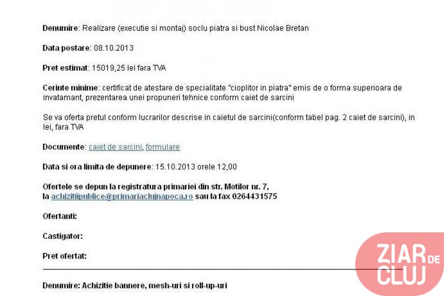 Bustul compozitorului Nicolae Bretan, pnetru soclul caruia Primaria a cheltuit aproape 13.000 de lei va fi dezvelit maine. Surprinzator de repede, avand in vedere ca a trecut doar o saptamana de la data limita de depunere a ofertelor pentru realizarea soclului.