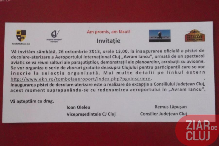 10.000 de persoane sunt asteptate la inaugurarea noii piste a Aeroportului International Cluj, in acest sfarsit de saptamana. Aeroportul pregateste un miting aviatic, iar 200 de persoane vor avea ocazia sa survoleze orasul, intr-o cursa inaugurala. Presedintele Consiliului Judetean Cluj, Horea Uioreanu a trimis clujenilor 50.000 de invitatii, platite in bugetul de promovare a proiectului. Suparat, Ioan Oleleu, vicele CJ Cluj si seful de proiect pentru aceasta investitie, a tiparit si el 15.000 de invitatii, din banii lui.