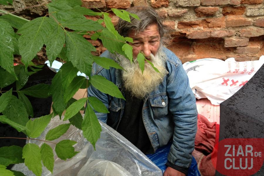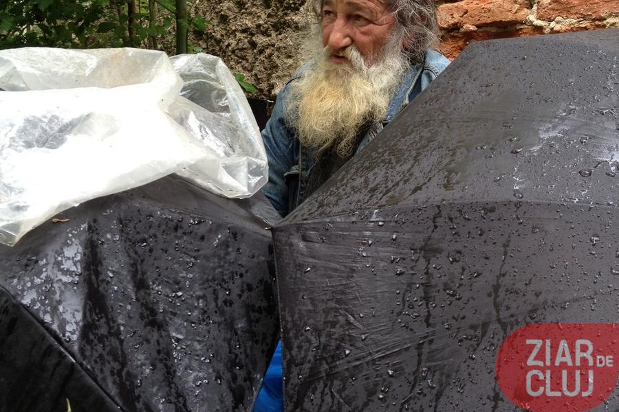E in curtea Bisericii Ioan Bob, in spatele celor doua banci si a tufisurilor. Sta acoperit de trei umbrele si o bucata de nailon, in timp ce doarme in ploaie, pe patul de carton. Tot ce are, incape sub cele trei umbrele asezate cu grija, sa-l fereasca de umezeala: un plic de cafea instant, cateva caserole si o franzela. Sprijinit de zid sta un baston, iar langa e proteza piciorului, infasurata intr-o punga albastra. E invalid de gradul II, ne spune, dupa ce se mai dezgheata putin.
