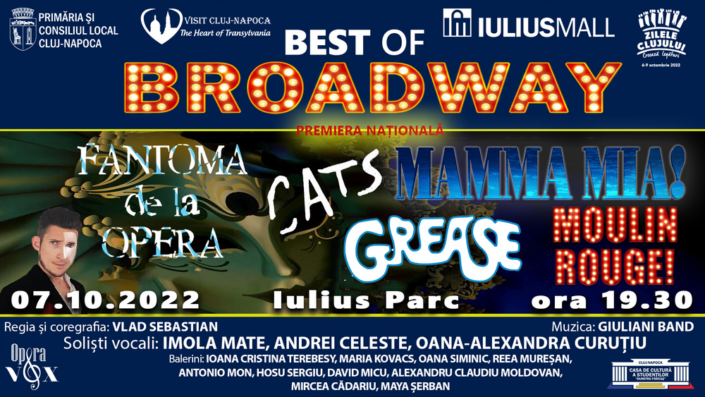Iulius Mall Cluj s-a alăturat evenimentelor din cadrul „Zilele Clujului”, concept care la cea de a zecea ediție, pune în lumină multiplele fațete culturale ale orașului. Astfel, vineri, 7 octombrie, de la ora 19.30, pe scena din Iulius Parc vor urca soliștii vocali: Imola Mate, Andrei Celeste, Oana Alexandra Curuțiu și balerinii Ioana Cristina Terebesy, Maria Kovacs, Oana Siminic, Reea Mureșan, Antonio Mon, Hosu Sergiu, David Micu, Alexandru Claudiu Moldovan, Mircea Cădariu, Maya Șerban, care vor lua parte la o producție muzicală impresinonantă – „Best of Brodway”- ce are loc în premieră națională la Cluj-Napoca. Spectatorii vor putea savura musicalul „Fantoma de la Operă”, vor pătrunde într-o poveste despre dragoste şi familie, plină de energie, amuzament şi culoare prin intermediul „Mamma Mia”, se vor bucura de producția „Moulin Rouge”, se vor aventura alături de clanul pisicesc Jellicle în emoționanta poveste „Cats” și vor dansa pe piesele rock and roll din „Grease”. Spectacolul este o producție Opera Vox. Intrarea este liberă, iar acestui eveniment i se adaugă până duminică, 9 octombrie, alte activități, ce au loc în peste 30 de locuri din oraș. Programul complet pentru „Zilele Clujului” poate fi consultat pe www.zileleclujului.ro.