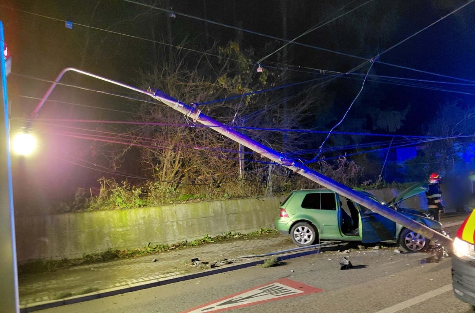 Accident pe o stradă din Dej. O mașină a rupt un stâlp de curent