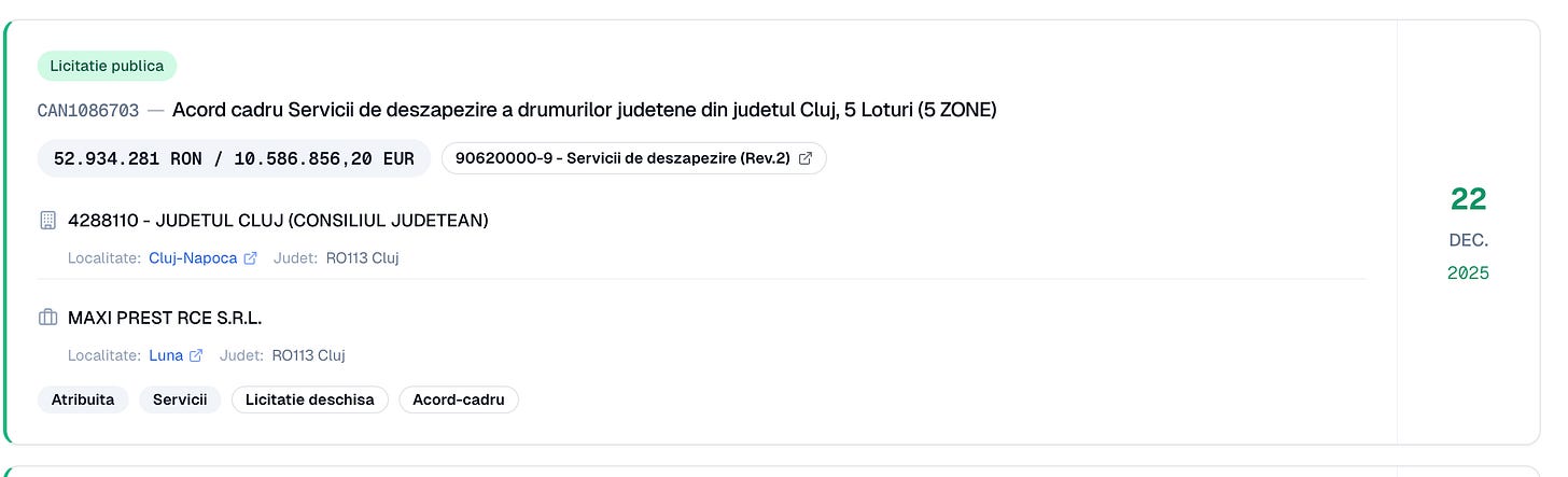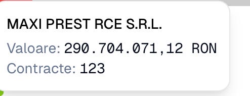 Firma de mai sus, Maxi Prest RCE e un serele ce facea initial termopane. Un nenica pe nume Ispas Rusu, ce anul trecut n-a trecut de un milion de euro cifra de afaceri, a “lovit” anul aiesta de la Tise aproape 60 de milioane de euro din licitatii.