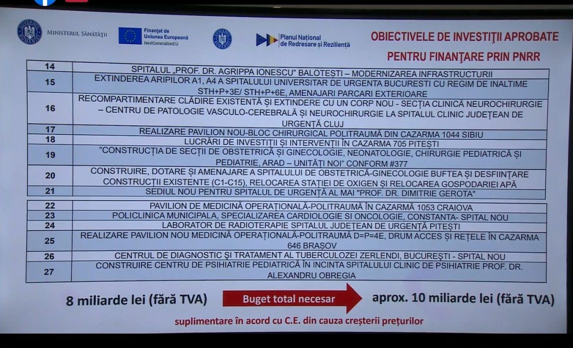 Ministrul Sănătății, Alexandru Rafila, a anunțat, miercuri, într-o conferință de presă, cele 27 de spitale sau secții noi care vor fi construite prin Planul Național de Redresare și Reziliență (PNRR). DIN PĂCATE, dar previzibil (de altfel am tot scris despre gargara triumfalistă a autorităților locale) la Cluj este doar o ”recompartimentare clădire existentă și extindere corp nou – secția clinică neurochirurgie – centrul de patologie cardio-vasculară și neuro-chirurgie la Spitalul Clinic Județean de Urgență Cluj”