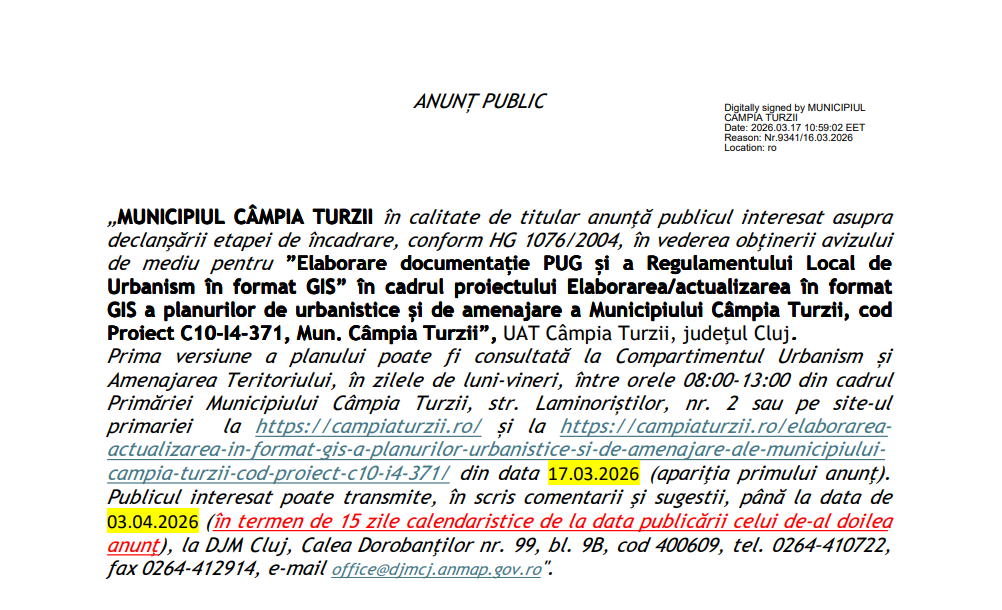 ANUNȚ PUBLIC – Primăria Câmpia Turzii