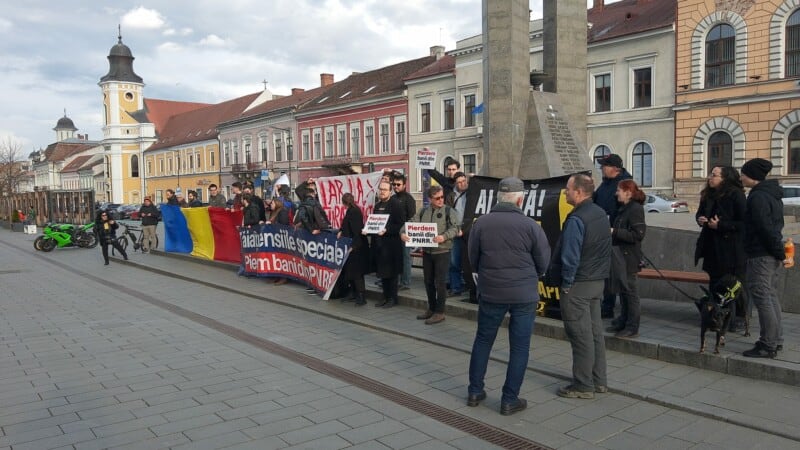 Mesajele care au fost afișate: ”Tăiați pensiile speciale”, ”Pierdem banii din PNRR”.