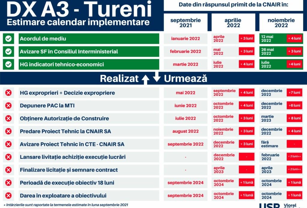 - El spune că, față de raportul din septembrie 2021 – în care întârzierile au fost, pe etapele realizate, de până la șapte – opt luni – raportul din noiembrie 2022 estimează reducerea întârzierilor pentru etapele din 2023-2024.