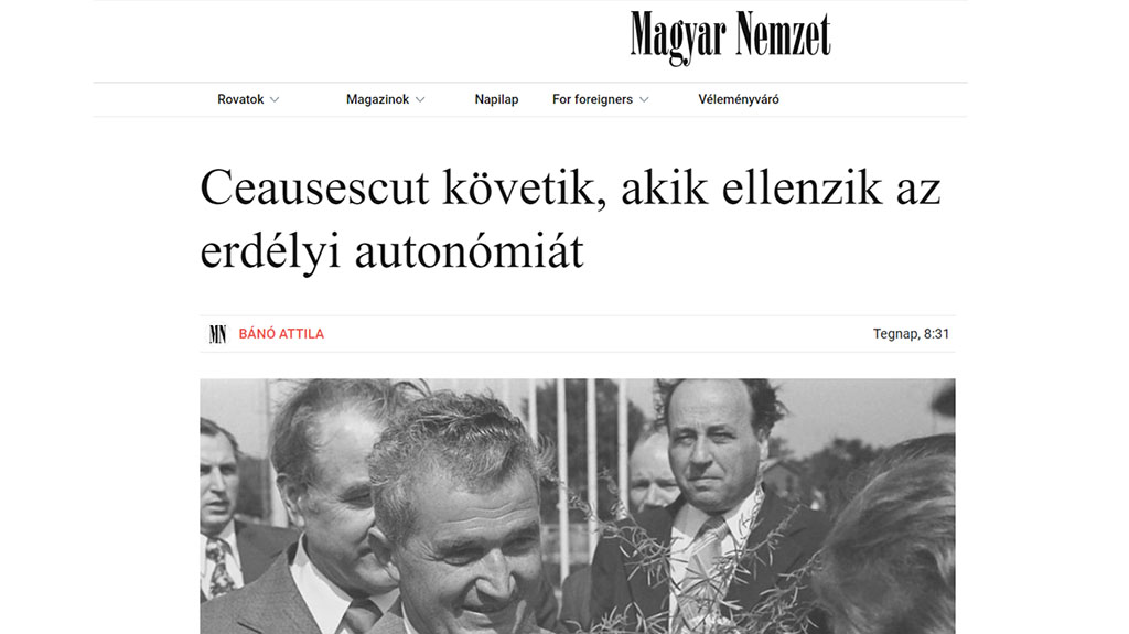 Acesta manifestă aceeaşi atitudine faţă de năzuinţele spre autonomie ale maghiarilor din Transilvania ca şi provocatorii din Tuşnad. Dl Iohannis, născut în Sibiu şi fiind multă vreme primar al localităţii, cunoaşte mult mai bine istoria reală a Transilvaniei decât scandalagii inculţi, cu toate acestea manifestă aceeaşi atitudine cu cea a acestora.