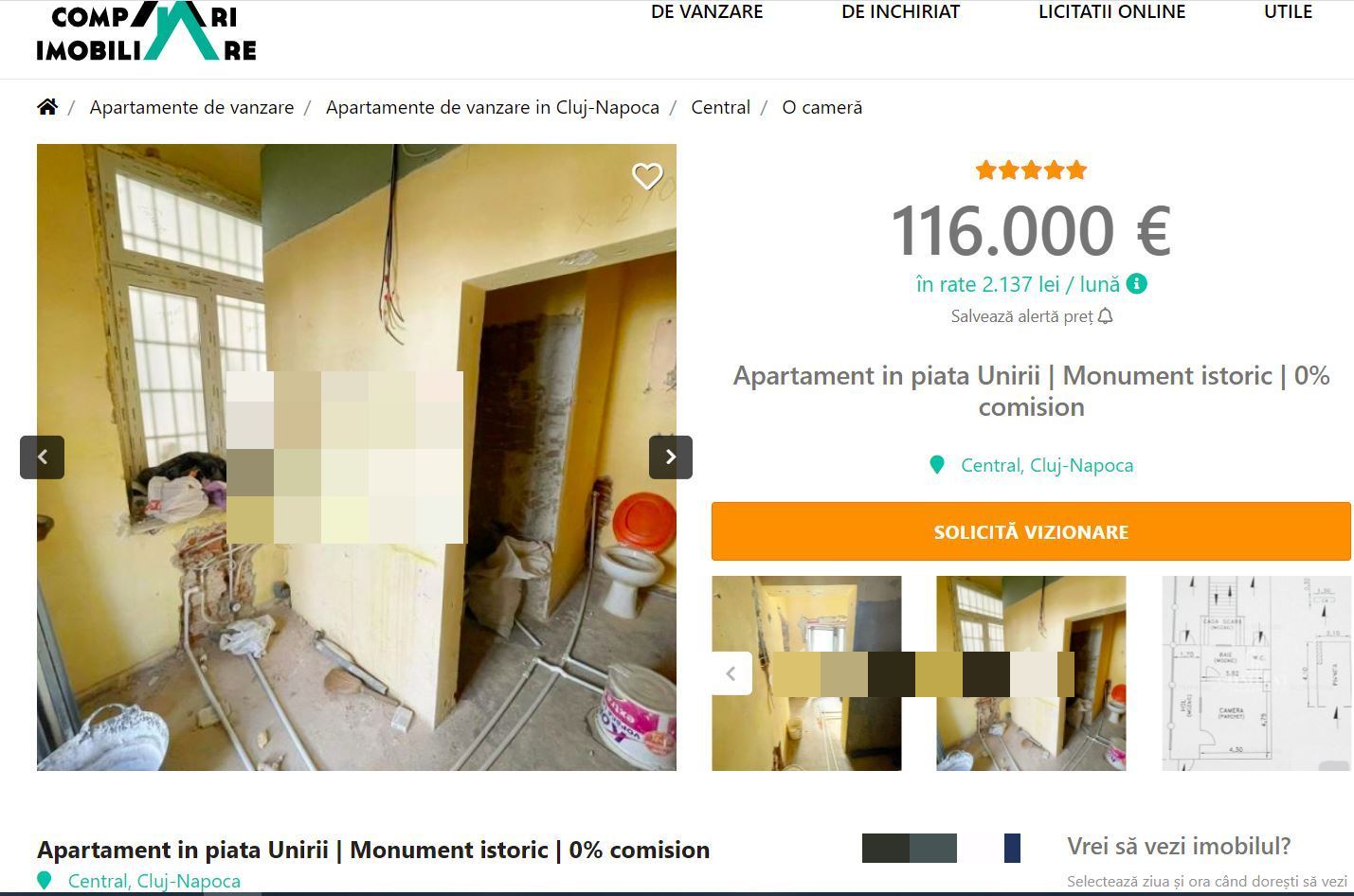 Un apartament de „o cameră, o bucătărie, o cămară pentru alimente, o baie, dar și o pivniță aerisită natural” este scos la mezat pentru suma de 116 000 de euro.