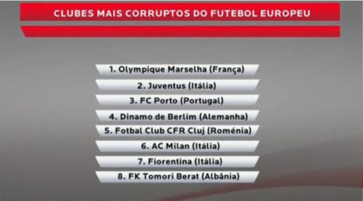 Jurnaliștii postului TV al echipei de fotbal Benfica Lisabona au realizat un top al celor mai corupte echipe de fotbal din Europa. Pe lista lor se află nume mari precum Marseille, FC Porto, Juventus, sau AC Milan, dar și o echipă din Liga 1: CFR Cluj apare în topul prezentat de portughezi, informează prosport.ro.