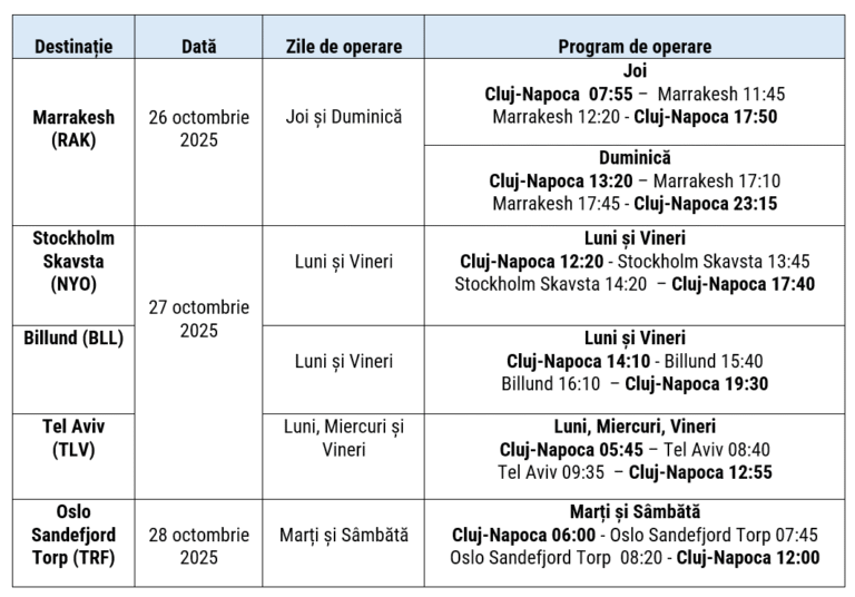 Din 28 octombrie 2025 Wizz Air va opera și zborurile spre Oslo Sandefjord Torp cu 2 frecvențe pe săptămână, în zilele de marți și sâmbătă. Zborurile spre destinațiile Marrakesh și Oslo Sandefjord Torp sunt operate în premieră absolută pe aeroportul clujean, iar referitor la zborurile spre Stockholm Skavsta, Billund și Tel Aviv, aceastea au mai fost operate în anii trecuți.