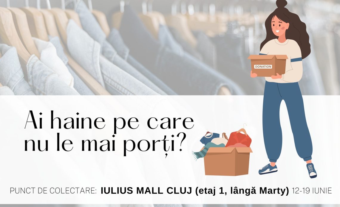 Iulius Mall Cluj găzduiește un punct de colectare a articolelor vestimentare ce nu ți se mai potrivesc și care în perioada 22 – 24 iunie 2023, își vor găsi noi proprietari în cadrul târgului ReClothing, cu scop caritabil. Astfel, până pe 19 iunie poți aduce rochiile ce nu se mai asortează cu stilul tău, tricourile care nu te mai reprezintă sau orice alte piese pe care nu le mai porți, dar le poți transforma în fapte bune. Inițiativa este derulată de JCI, iar proiectul a fost recent premiat internațional.