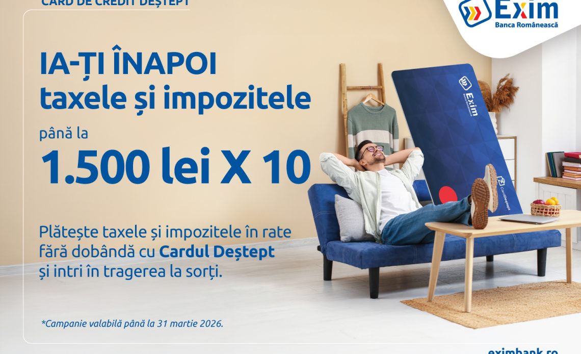 Exim Banca Românească lansează o nouă campanie promoțională prin care deținătorii de Carduri Deștepte – cardul de credit Mastercard Standard și cardul de credit Mastercard Gold, pot recupera valoarea taxelor și impozitelor achitate în rate fără dobândă.