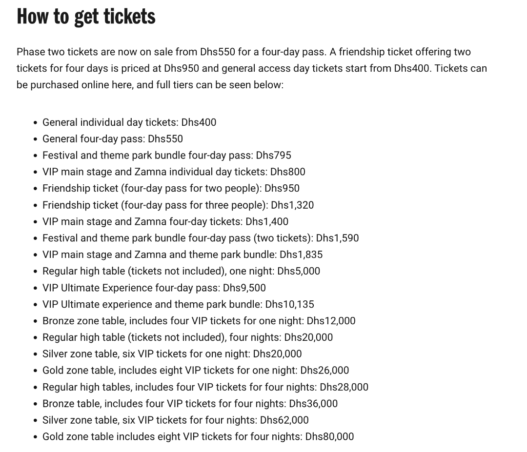 • Ultima zi: ofertă 500 AED pentru 2 bilete / acces 4 zile care face ca un bilet sa coste 250 AED.
