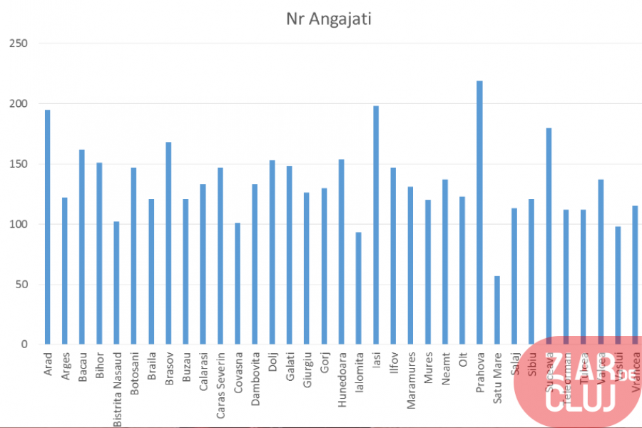 Consiliul Judetean Cluj are 110 angajati, spre deosebire de alte institii de gen din tara, care au, in medie, 150 de salariati. La unele dintre ele lucreaza chiar si 200 de oameni – asta se intampla in Arad, Iasi si Suceava. Judetul Prahova e campion la aceasta categorie – la Consiliul Judetean Prahova lucreaza 220 de angajati.