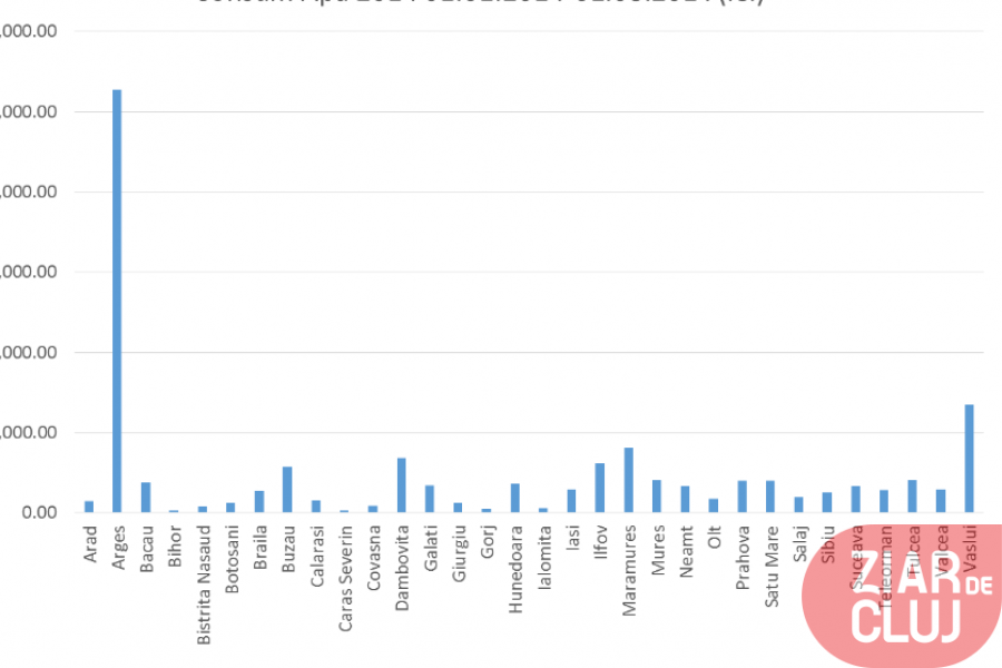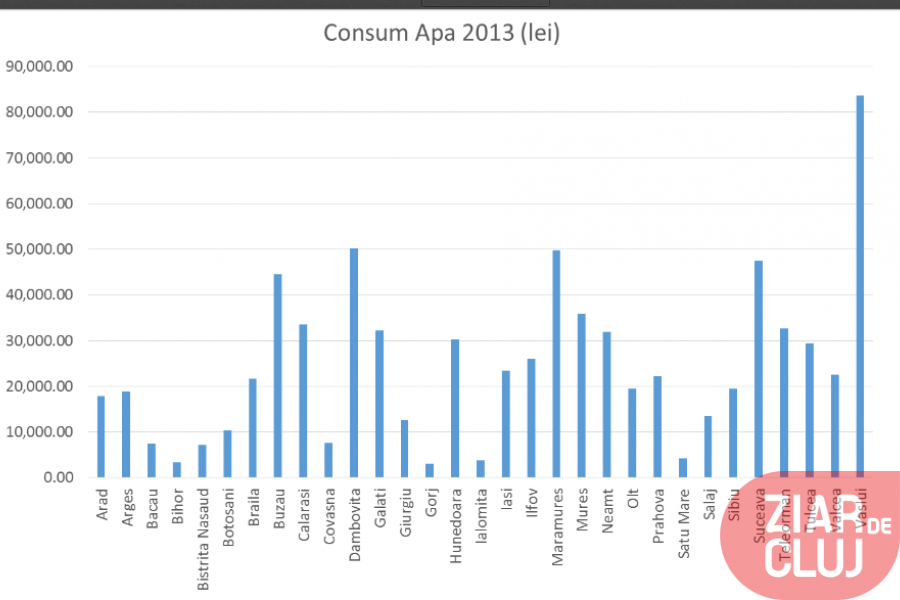 In 2013, cu o suma achitata de 8.134 de lei, consumul de apa al CJ Cluj a fost de trei ori mai mare decat al judetelor Bihor, Gorj, Ialomita si Satu Mare. Cu toate acestea, exista judete care au platit zeci de mii de lei pentru apa consumata in institutie. Vasluiul, de exemplu, a decontat peste 80.000 de lei doar pentru acest serviciu.