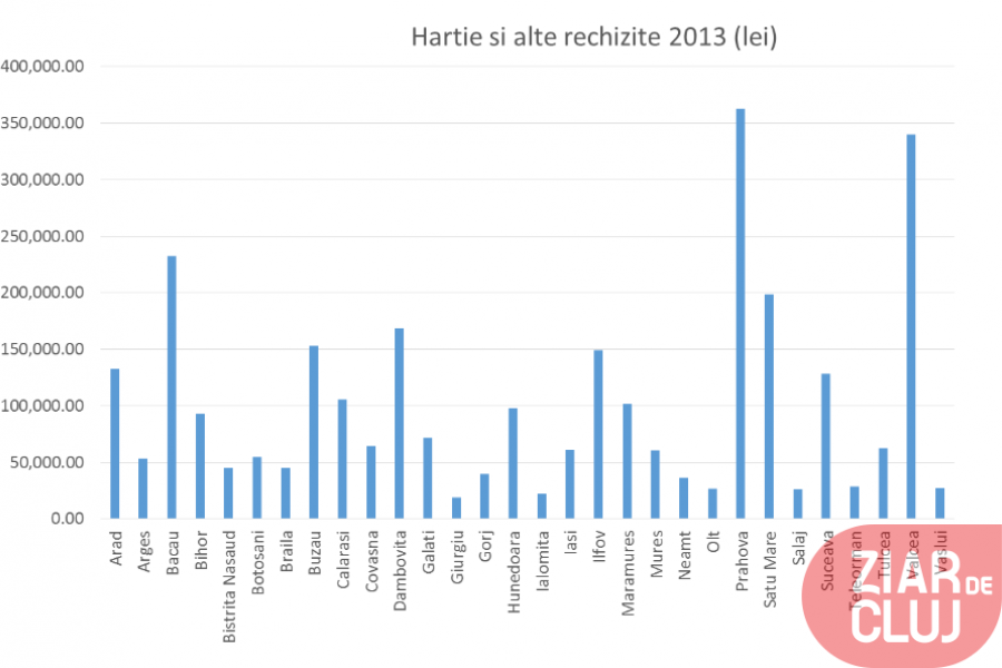 Consiliul Judetean Cluj a spart, in 2013, pe “hartie si rechizite”, peste 217.000 de lei, de cinci ori mai mult decat media nationala. Prin comparatie, consiliile judetene din Bistrita Nasaud, Botosani, Braila, Giurgiu, Gorj, Ialomita, Neamt, Olt, Salaj, Teleorman si Vaslui nici macar nu au atins pragul de 50.000 de lei pentru acest serviciu.