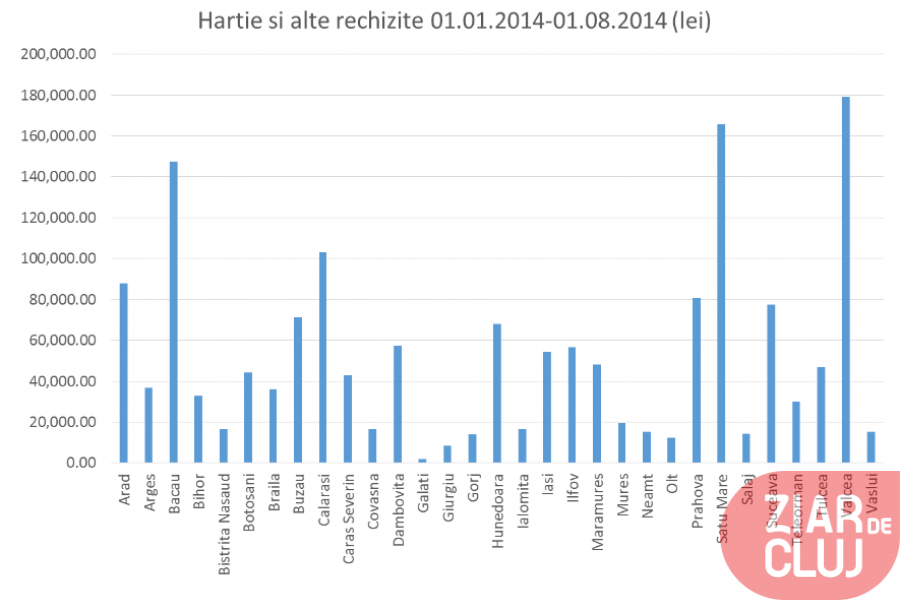 CJ Cluj nu s-a dezis nici in 2014, cand a cheltuit 202.500 de lei pe aceeasi papetarie. Cea mai mare suma din intreaga tara! Asta in conditiile in care consiliile judetene din Bistrita Nasaud, Covasna, Galati, Giurgiu, Gorj, Ialomita, Mures, Neamt, Olt, Salaj si Vaslui nu au atins nici macar pragul de 20.000 de lei pentru acelasi serviciu.