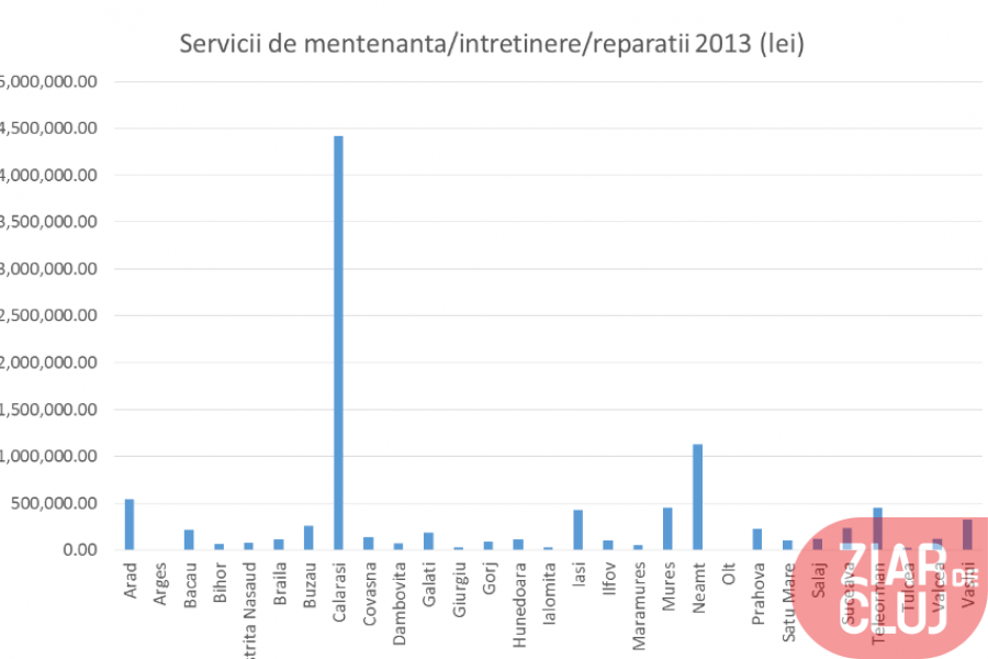 Pentru “mentenanta, reparatii si intretinere” in anul 2013, Consiliul Judetean Cluj a platit 594.000 de lei. Adica tot atat cat au platit, la un loc, judetele Arges, Bihor, Braila, Dambovita, Giurgiu, Ialomita, Maramures si Tulcea.