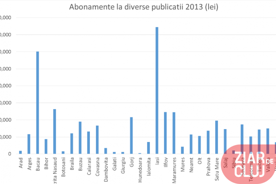In 2013, angajatii Consiliului Judetean Cluj au cheltuit 47.200 de lei pentru “abonamente la diverse publicatii”. Arad, Botosani, Dambovita, Galati, Giurgiu, Hunedoara, Ialomita, Mures, Sibiu si Vaslui nu au atins nici macar pragul de 10.000 de lei.