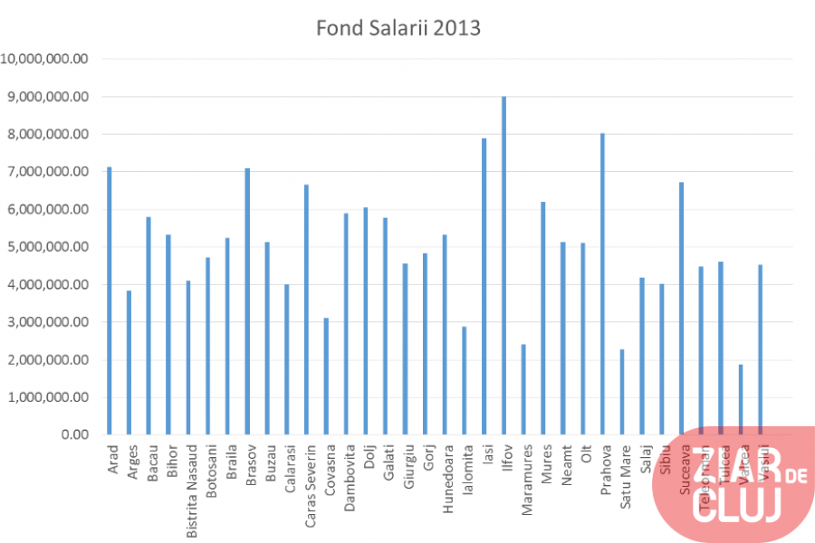 Cu toate acestea, fondul de salarii al Consiliului Judetean Cluj a fost, in 2013, de trei ori mai mare decat cele ale judetelor Maramures, Satu Mare sau Valcea, care au mai multi angajati decat Clujul. Anul trecut, CJ Cluj a avut un fond de salari de 6.850.000 de lei.