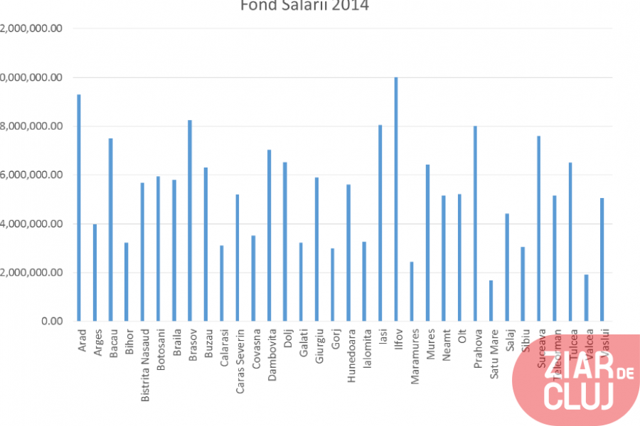 In 2014, fondul de salarii al Coniliului Judetean Cluj a fost de 6.358.000 de lei. Adica de aproape patru ori mai mare decat al Consiliului Judetean Satu Mare.
