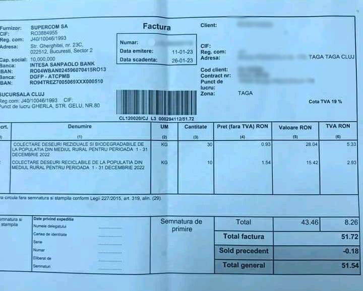 Un clujean din localitatea Ţaga s-a trezit cu o factură la salubritate de 51,54 de lei.
