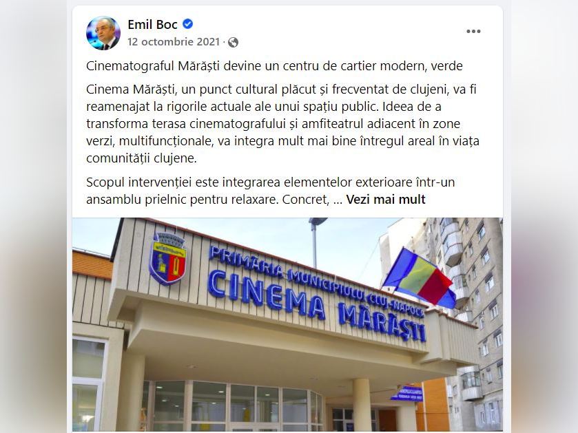 În toamna anului 2021, Cinematograful Mărăști se transforma într-o promisiune marca OSĂ a lui Emil Boc. OSĂ ”devină un centru de cartier modern, verde”.