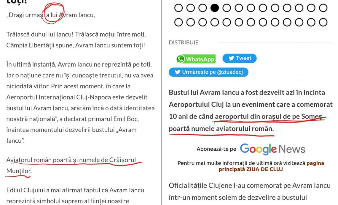 Desigur, noi cinstim memoria lui Avram Iancu, celebrul aviator reîncarnat peste ani în Traian Vuia și dezvelim un bust în Aeroportul din Cluj-Napoca, unde Domnul Primar, deși vorbește despre eroul Avram Iancu și despre identitatea națională, vorbește degeaba, pentru că presa înțelege ce vrea.