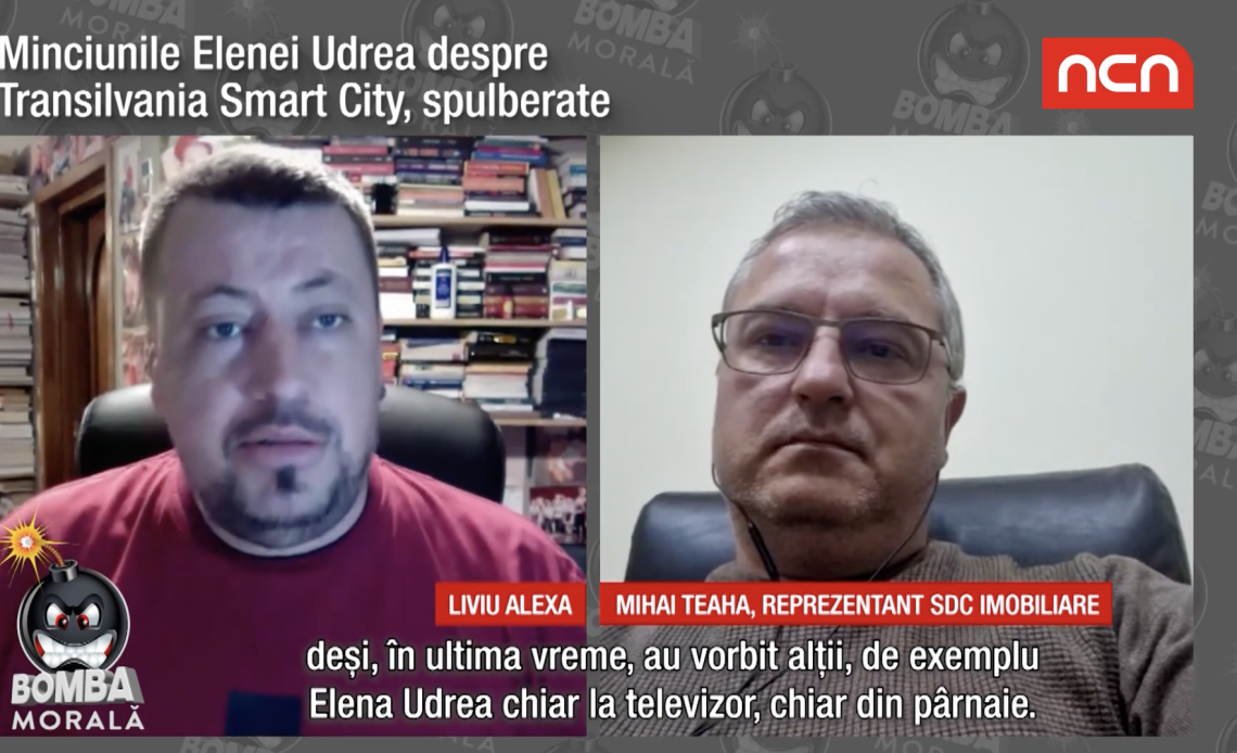 LIVIU ALEXA: Bine ați venit la „Bomba morală”! Sunt Liviu Alexa și astăzi am un invitat mai interesant pentru ceea ce o să ne spună, pentru că nu a prea vorbit în calitate de reprezentant al firmei SDC Imobiliare, partener în proiectul Transilvania Smart City, deși, în ultima vreme, au vorbit alții, de exemplu Elena Udrea chiar la televizor, chiar din pârnaie. Au vorbit reprezentanții societății Elenei Udrea, au spus foarte multe. Multe se dovedesc a fi minciuni și vreau să lămurim și cu această parte care este foarte importantă – SDC Imobiliare – din proiect. Să cernem grâul de neghină odată pentru totdeauna și, de data asta, pe documente. Domnule Mihai Teaha vreau să intrăm direct în subiect și să vă întreb: în acest moment care este situația acestui proiect? Cine ce deține?
