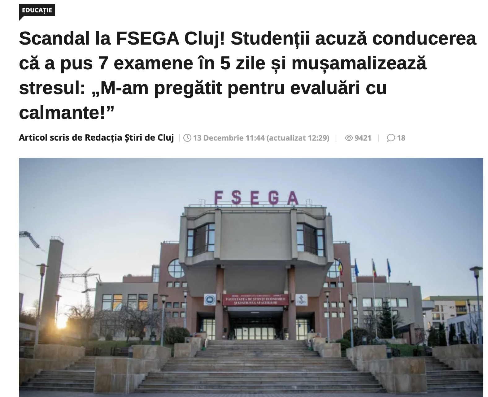 Stiri de Cluj scrie ca, recent, Facultatea de Științe Economice și Gestiunea Afacerilor (FSEGA) a Universității Babeș-Bolyai Cluj a încercat să promoveze pe rețelele sociale o serie de imagini cu studenții care se pregăteau pentru săptămâna de evaluări, care tocmai s-a încheiat ieri: studenți concentrați, energie pozitivă, cafele și zâmbete în sălile luminoase și colțurile de studiu. „Spiritul lor de echipă, ajutorul reciproc și comunitatea” au fost cuvintele cheie folosite în postare.