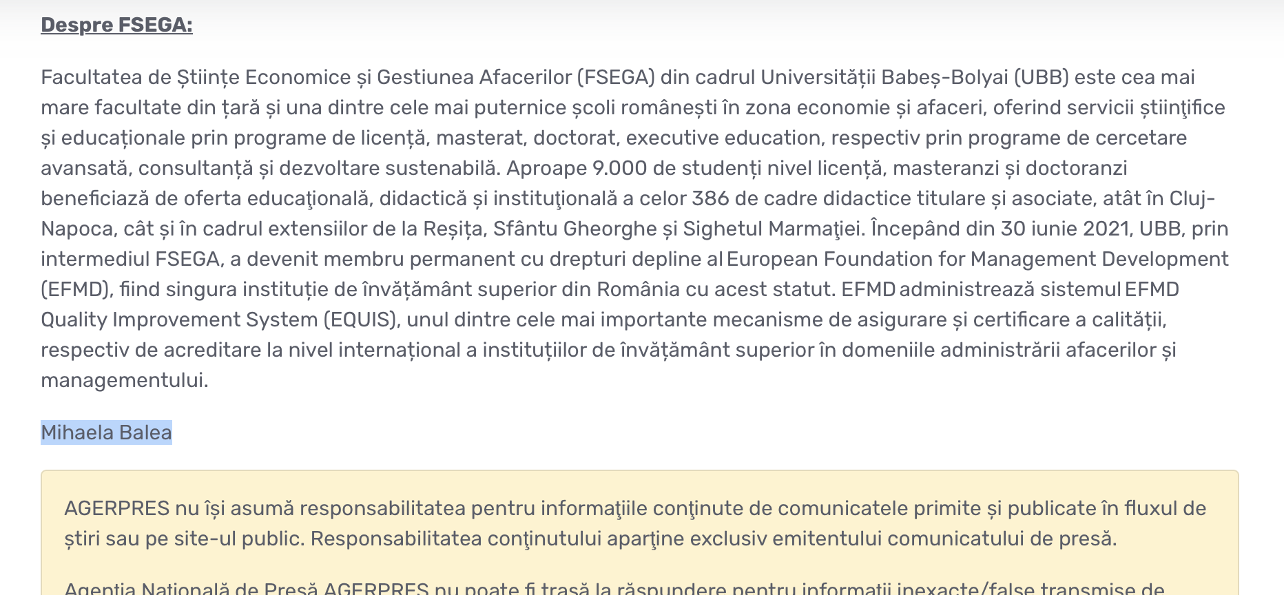 „Responsabila” pentru „comunicare” este o umflatica cu CV profesional light ca si iaurtul fara grasime, pe numele ei Mihaela Balea, o macumba care se si rasfata, draga de ea, autodenumindu-se „Micaela”, manca-ti-as, pe care cel mai probabil FSEGA a angajat-o pentru cateva sute de euro lunar, „abonament”, ca sa spameze presa locala si nationala cu CACATURI. De unde stim ca isi zice MICAELA? Pai. din email. Fiidnca da emailuri ca ultima târlǎ piarizdǎ in care spameaza redactiile milogindu-se pentru niste free media.