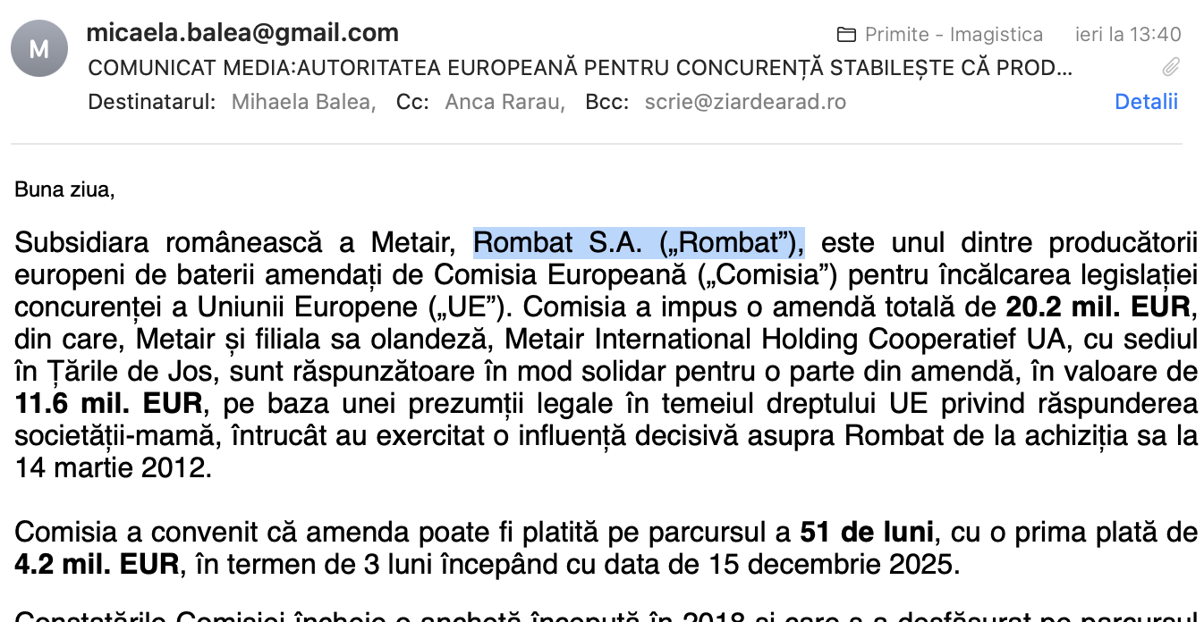 Dar stati calmi, ca sunt si in privat idioti. De exemplu cei din conducerea firmei ROMBAT, in frunte cu Alin Romulus Ioanes, ii dau pinguinoaiei de Balea si ei cel mai probabil 1000 de euro pe luna sa spameze SI din partea Rombat presa. In mailul de azi, Baluta vorbeste in punga cat e de nedreapta Comisia Europeana ca i-a amendat.