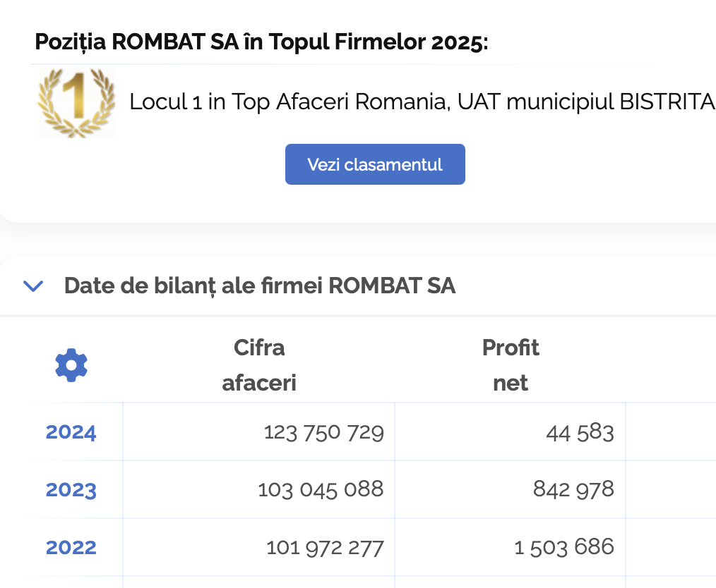 In loc sa se certe cu Comisia Europeana, nea Ioanes ar face bine sa faca si ceva profit pentru Rombat, fiindca anul trecut sunt cel putin 10 placintarii de pe raza judetului Bistrita-Nasaud care au facut profit mai mare decat „liderul” Rombat. Sau poate ar trebui ANAF Bistrita-Nasaud sa ne lamureasca cum rahat o firma cu cifra de afaceri de 123 de milioane de EURO pe an face doar 44 ooo de euro profit.