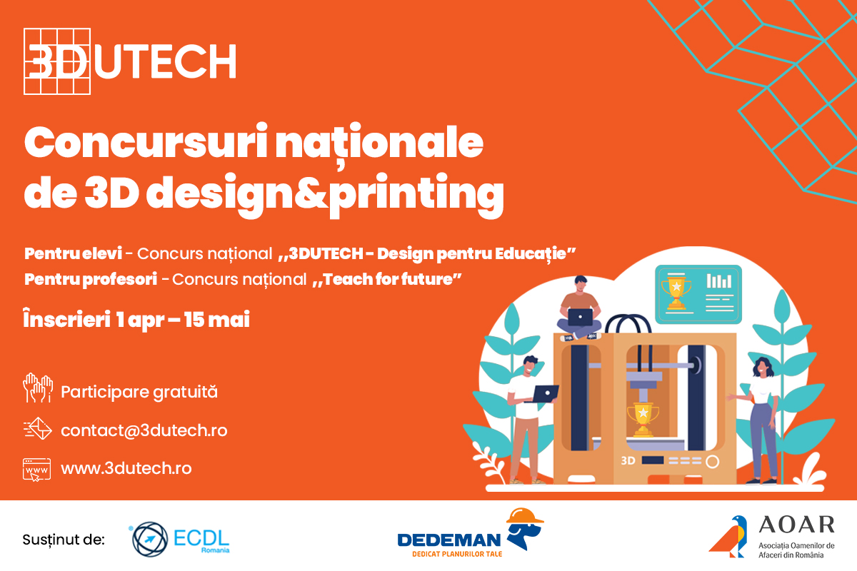Concursul național „3DUTECH – Design pentru Educație” este adresat elevilor. Aceștia își pot expune ideile de design utilizând aplicații din domeniul modelării și imprimării 3D. Tema propusă în 2022 este „Design pentru Educație”.