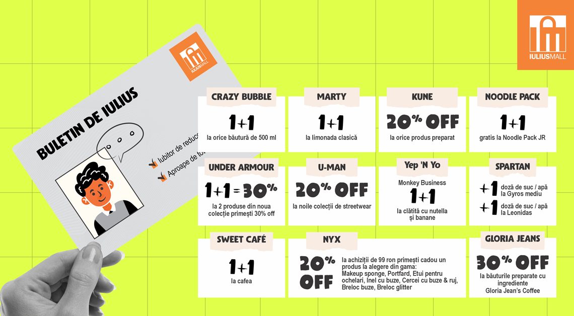Buletin ai, carnet de student – cel mai probabil, posibil să deții chiar și permis de conducere. Însă „buletin de Iulius” ai? Intră în posesia celui mai cool „ID”, care îți aduce oferte speciale la o serie de locații din Iulius Mall. „Buletinul de Iulius” include 11 promoții, iar dacă le bifezi pe toateprimești un voucher pe care îl poți utiliza pentru a achita parcarea.