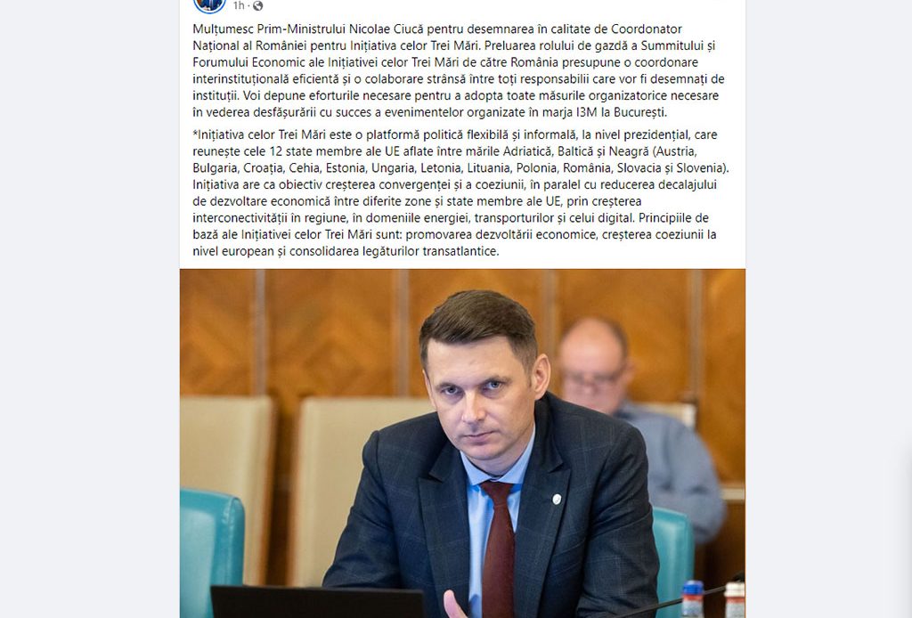 „Mulțumesc Prim-Ministrului Nicolae Ciucă pentru desemnarea în calitate de Coordonator Național al României pentru Inițiativa celor Trei Mări. Preluarea rolului de gazdă a Summitului și Forumului Economic ale Inițiativei celor Trei Mări de către România presupune o coordonare interinstituțională eficientă și o colaborare strânsă între toți responsabilii care vor fi desemnați de instituții. Voi depune eforturile necesare pentru a adopta toate măsurile organizatorice necesare în vederea desfășurării cu succes a evenimentelor organizate în marja I3M la București.