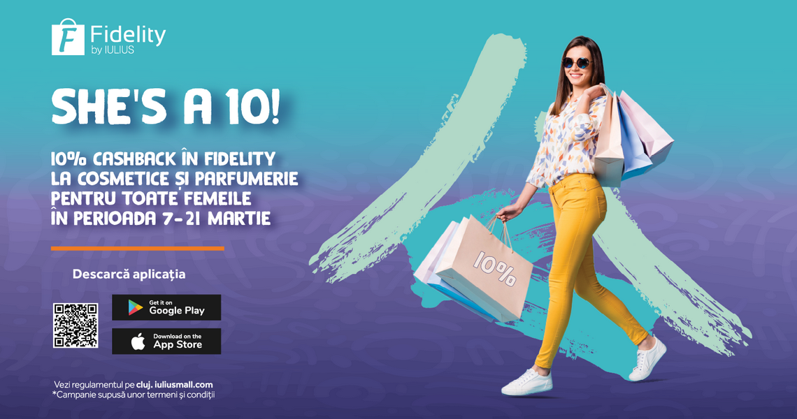 Cel mai frumos cadou de primăvară este, totodată, și cel care te inspiră să te bucuri de tot ce te înconjoară. La Iulius Mall Cluj continuăm să le celebrăm pe femeile din viața noastră printr-o campanie dedicată lor. „She’s a 10!”, iar aplicația Fidelity by Iulius le oferă 10% cashback pentru toate produsele din categoria cosmetice și parfumerie.