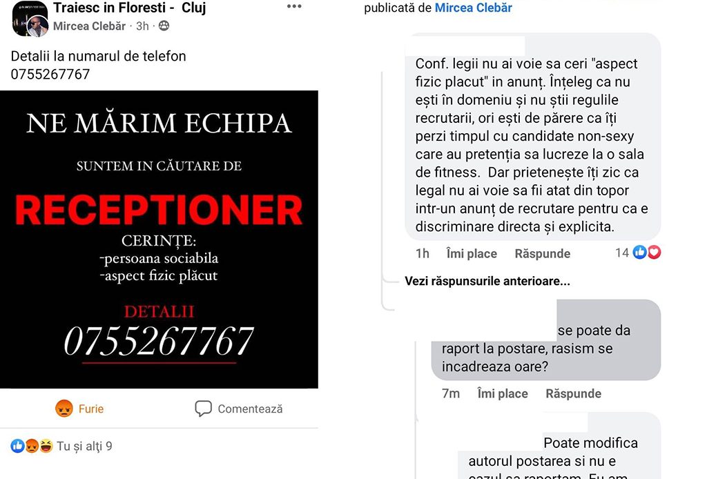 Pe un grup de discuții pe Facebook din Florești, o persoană de gen masculin, a postat un anunț de angajare discriminator: