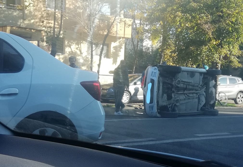 Nu ştim încă din ce cauze maşina din imagine s-a răsturnat pe partea laterală pe Bulevardul Nicolae Titulescu din cartierul Gheorgheni din Cluj-Napoca. Îţi trebuie ceva talent şoferistic pentru o astfel de cascadorie…