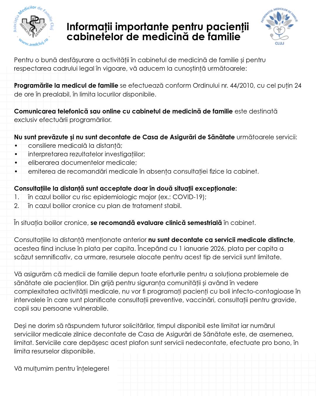 Petronatul Medicilor de Familie Cluj au transmis o serie de informații importante pentru pacienții cabinetelor de medicină de familie, printre care faptul că programarea la medicul de familie – cu minim 24 ore în prealabil, în limita locurilor disponibile, iar consilierea telefonică sau online nu este acceptată decât în situațiile prevăzute în lege.