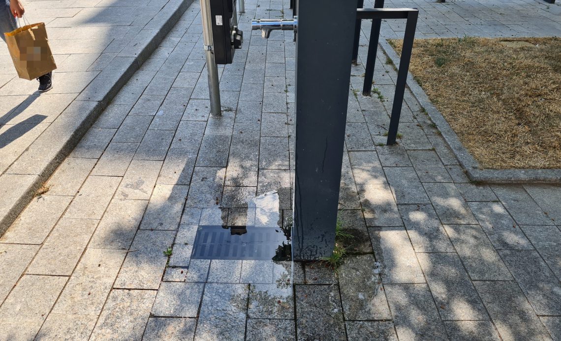 Toate cișmelele noi montate în oraș stropesc în jur, însă cea din scuarul CEC stropește în baltă, fiindcă canalizarea proaspăt realizată s-a și înfundat.