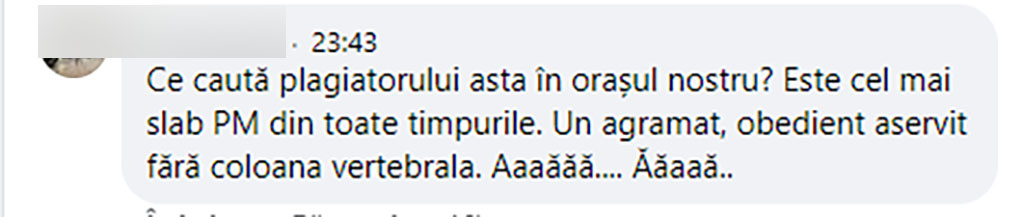 „Ce caută plagiatorului asta în orașul nostru? Este cel mai slab PM din toate timpurile. Un agramat, obedient aservit fără coloana vertebrala. Aaaăăă…. Ăăaaă…”