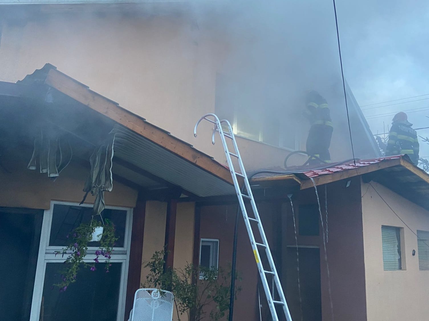 În momentul sosirii la locul solicitări, echipajele operative au găsit acoperisul casei, cu o suprafață de 160mp, cuprins în totalitate de flăcări, cu posibilitatea de propagare la o anexă din gospodărie și la o cabană amplasată în vecinătate.