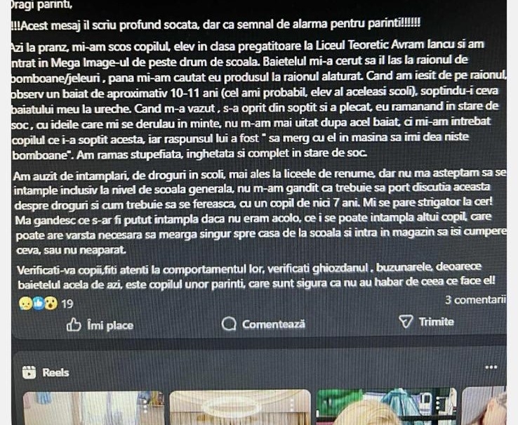 Mămica unui copil în clasa pregătitoare la Liceul Avram Iancu a postat un mesat terifiant pe un grup dedicat mămicilor din Cluj în care susține că fiului ei de doar 7 ani i-au fost oferite „bomboane” (droguri) de un copil mai mare. Șocant este că incidentul a avut loc în magazinul aflat în proximitatea liceului. Femeia nu credea că și copiii atât de mici pot fi victime, în ciuda fenomenului extrem de răspândit al consumului de droguri în școlile clujene.