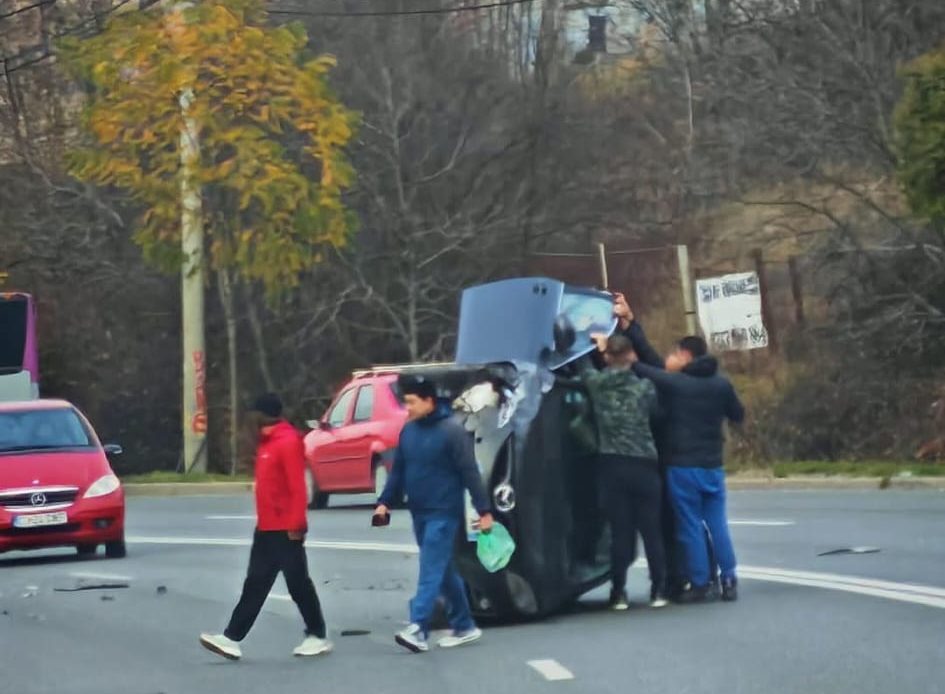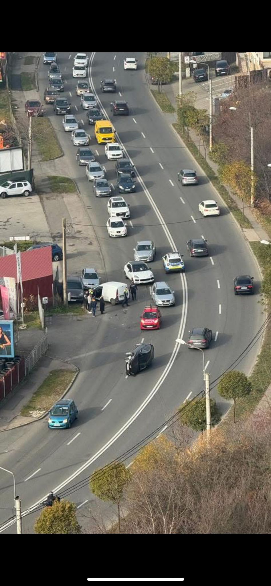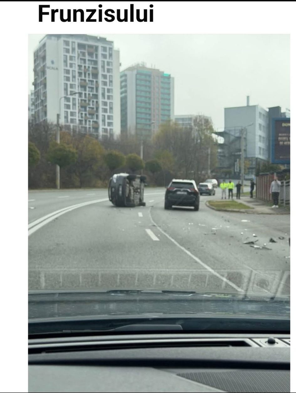 O mașină s-a răsturnat pe banda de urcare de pe strada Frunzișului. În acest moment circulația este blocată.