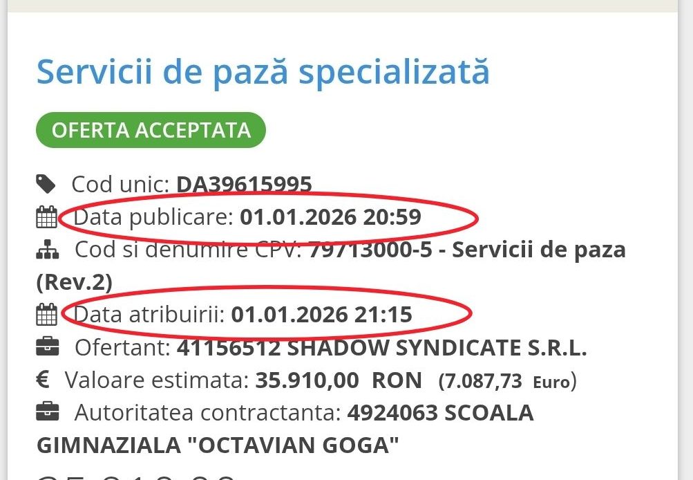 Aseară pe la 9, când – în mod normal – încă ai dileme de tipul „termin salata de boeuf sau trec pe zeamă de varză”, cineva de la Școala Gimnazială „Octavian Goga” din Cluj-Napoca a atribuit paza școlii pe 3 luni, societății Shadow Syndicate SRL. Țac-pac, la fel ca anul trecut, când contractul pentru ianuarie-martie a fost atribuit, aceleiași societăți, tot la 1 ianuarie.