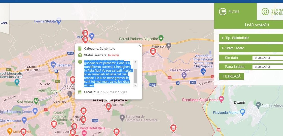 - că sesizări se generează una într-una (vezi foto mai sus) și sesizare clujean: ”Pe Aleea Baita nr. 12 gunoiul nu a fost ridicat de 7 zile. Grămezi de gunoaie sunt peste tot. Cand s-a transformat cartierul Gheorgheni în Pata Rât? Va rog sa luati masuri si sa remediati situatia cat mai repede. Pe zi ce trece gramezile sunt tot mai mari, ca nu le ridica nimeni”,